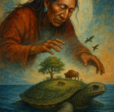 Maheo smiled. From that sacred mud, he began to shape the land. He placed the mud on the back of the turtle, who agreed to carry it and let it grow. The land spread and hardened, becoming wide and strong. In this way, Turtle Island—the Earth—was formed.